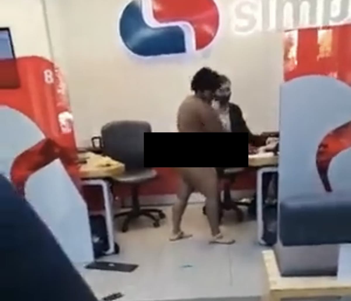 In the video one could see a male bank teller calmly. In the video the woman dressed only in sandals can be seen smashing a phone on the ground. The unidentified ŋαkєd woman can be seen going off at a bank consultant reportedly in the banks Strand branch.